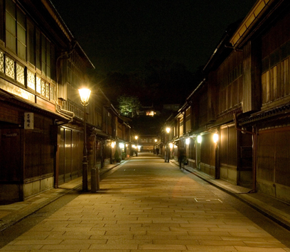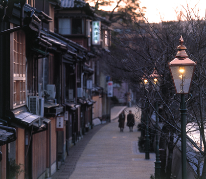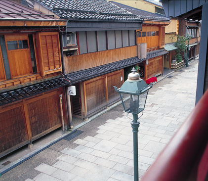 金沢の茶屋街の歴史は古く、文政3(1820)年に加賀藩の許可を得て、正式に茶屋街の町割りがされたと言われています。現在は東山地区の「ひがし」、野町地区の「にし」、浅野川大橋下流の「主計町(かずえまち)」の3つの茶屋街が残っています。いずれの茶屋街も出格子に石畳の風情ある町並みが美しく、「ひがし」「主計町」は国の重要伝統的建造物群保存地区に選定されています。このような風情ある町並みの中で芸妓を中心とした金沢の茶屋文化が培われてきました。